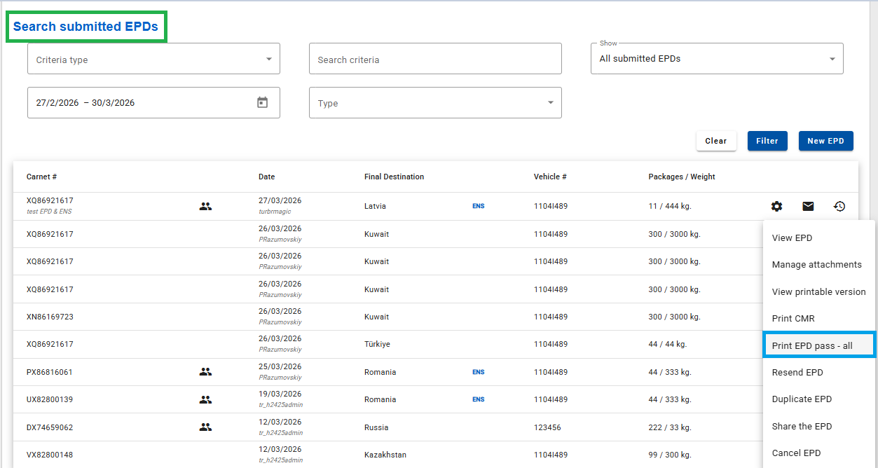 1. ENS Pass доданий разом з EPD Pass в функцію «Print EPD passall». Доступно з розділів Search Submitted EPDs (пошук направлених EPD) та Search Submitted ENSs (пошук направлених ENS).