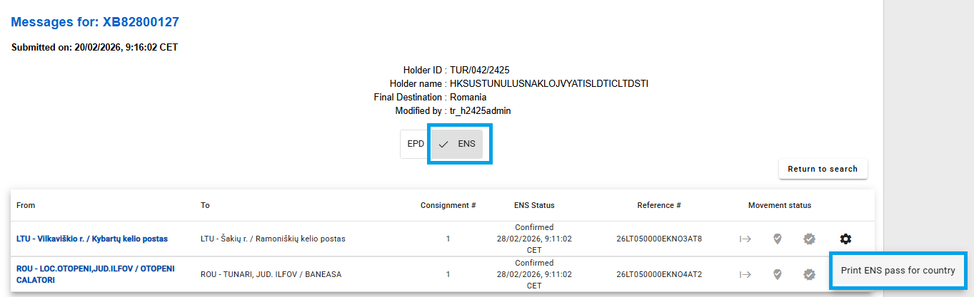 ENS pass можна роздрукувати для країни через: ENS messages history -> Print ENS pass for country (історія повідомлень ENS -> друк ENS pass для країни).